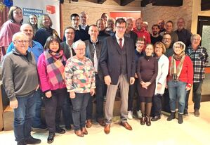 Die Delegierten und Kandidaten des SPD-Kreisverbandes mit Kreisvorsitzendem Martin Kreutz ( erste Reihe, 4. v.li.), stellv. UB-Vorsitzendem Marvin Kliem (1. Reihe, 6.v.re.) und OV-Vorsitzendem Heinz Uekermann (letzte Reihe, 5.re.) stehen geschlossen hinter ihrem Landratskandidaten Oskar Saller (vorne Mitte)