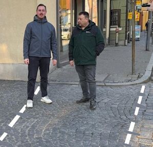 Bürgermeisterkandidat Ludwig Kerscher visualisiert seine Forderung nach mehr Sicherheit am Stadtplatz - Fußgängerfurten an den Einmündungen Dingolfinger Straße und Rosengasse, sowie am Rathaus gefordert